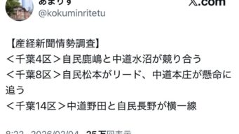 嫌儲 中道・野田代表、自民候補と接戦!これ落選したら中道はどうなるの🤔