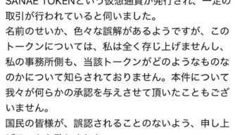 嫌儲 高市早苗「私はSANAE TOKENという仮想通貨には何も関わっていません。知りません。」