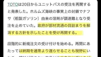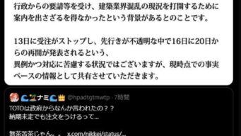 なんG 受注を停止したTOTO、政府の圧力で材料不足で納期未定のまま受注再開♥