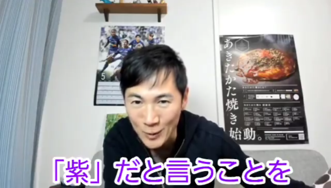 左は赤、右は青だから色が混ざると紫だって言いたいんだろう?