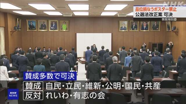 記事読めよ、N国がやってることを狙い撃ちしてるから可決された改正案では、ポスターに他人やほかの政党の名誉を傷つけるなど品位を損なう内容の記載を禁止することや、営利目的で使用した場合は100万円以下の罰金を科すことなどが盛り込まれています。