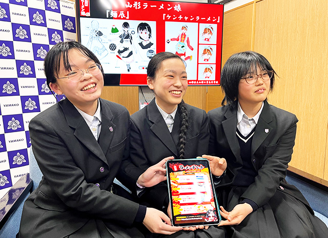 「ラーメン娘」を考案し、ラーメン店の販促に取り組む山形工業高の(左から)今野柚葉さん、水上美優さん、岳朋美さん=山形市・同校山形市内のラーメン店のイメージキャラクター「ラーメン娘」の制作を進める山形工業高(同市)の生徒が5日、同校で記者会見し、本県のラーメン文化発信に向け、いずれも同市内の「ケンチャンラーメン山形」と「麺辰」の2店舗でキャラクターと連携した誘客を始めると発表した。17日に特設サイトを開設し、両店のラーメン娘が登場するほか、オンライン限定メニューも販売する。