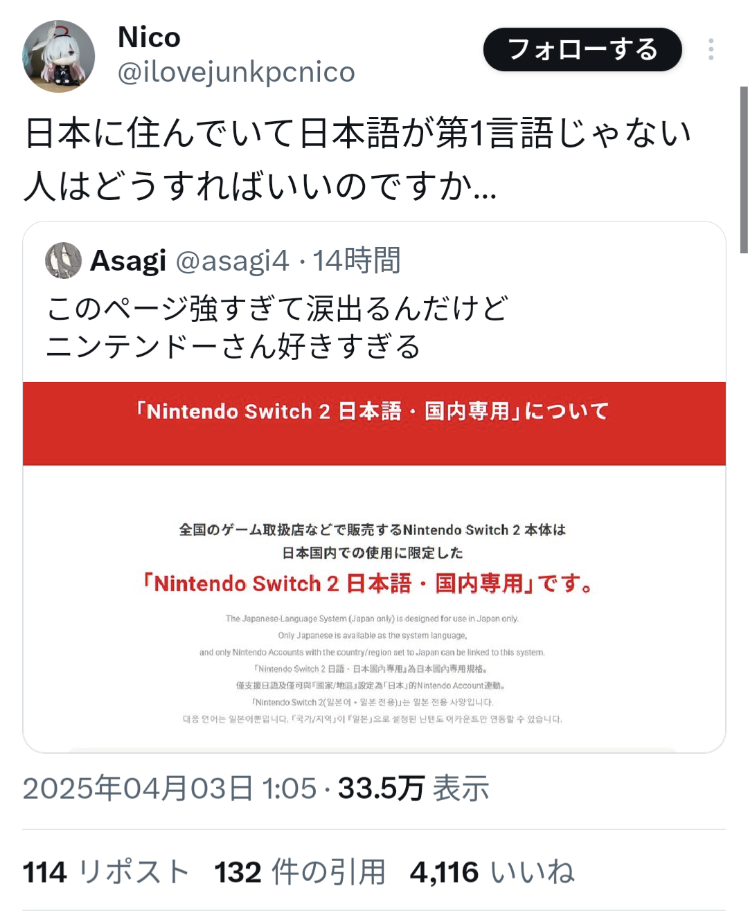 海外と日本でソフトの発売日違う物もあって例えば海外版の早く発売されたソフトを日本版の本体で遊ぼうとしても使えなかったりする 任天堂のはずっと前からそう - 19 : 2025/04/03(木) 14:05:50.75 ID:DFQshVdWa