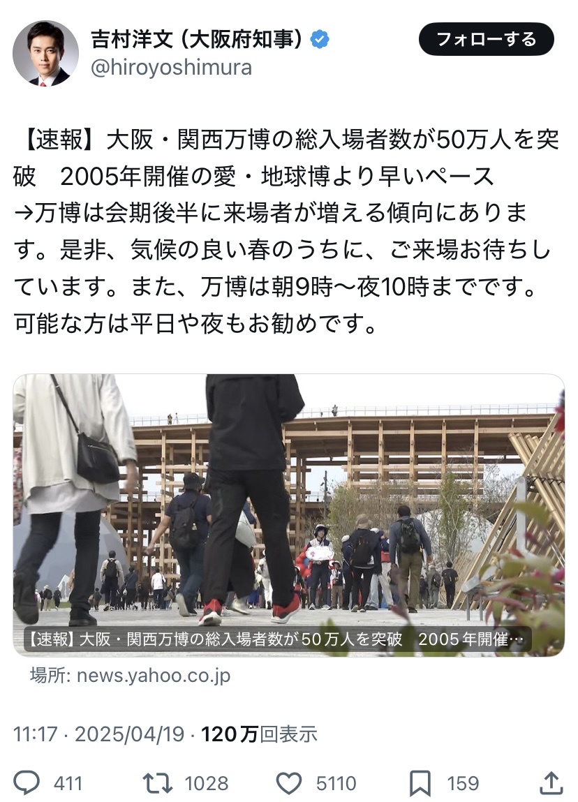 (財)2005年日本国際博覧会協会のHPによりますと、2005年に愛知県で開催された「愛・地球博」の50万人突破は開幕2週目に入ってからで、開幕6日目で突破した2025年大阪・関西万博はそれよりもペースが早いことになります。