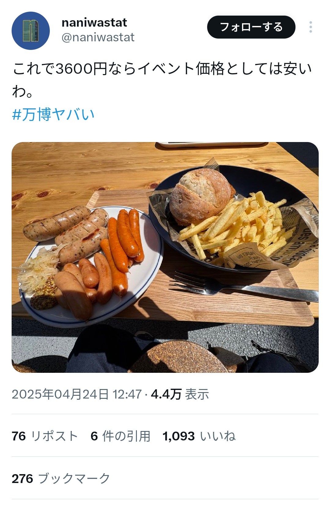 安いとは思わんけど、まあこの銭ゲバが横行する万博敷地内では良心的、という気はする下手な自称オクトーバーフェストや肉フェスなんかで出て来るものよりは、万倍マシに見えるな
