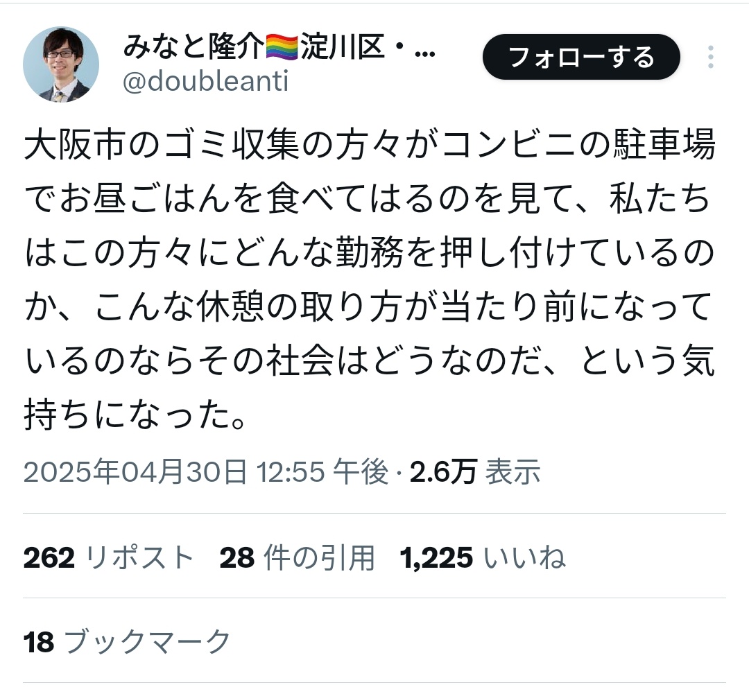 共産党「ゴミ収集の人がコンビニでご飯を食べていた。本当にこんな社会でいいのか?」