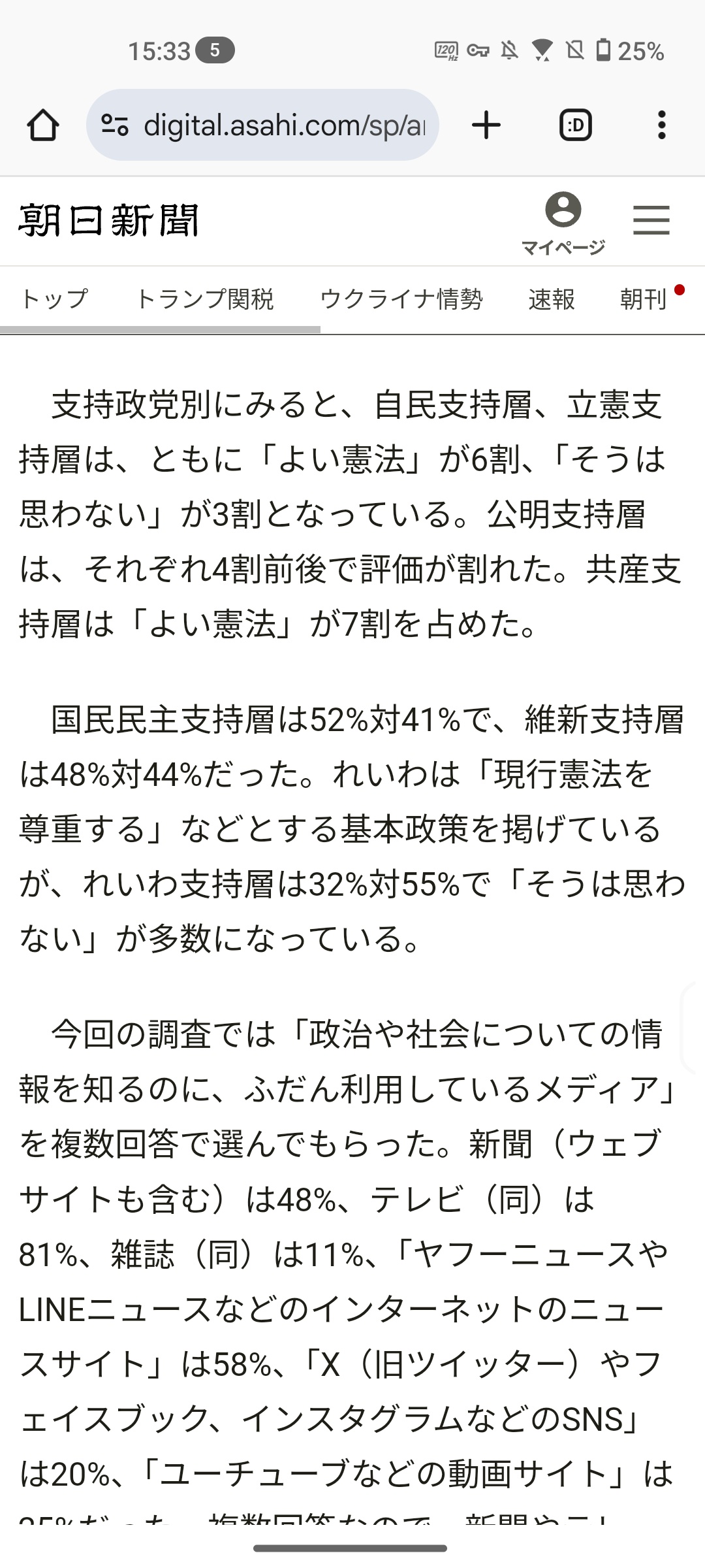 【悲】れいわ支持層「いまの憲法が良いとは思わない」55% 😲!?