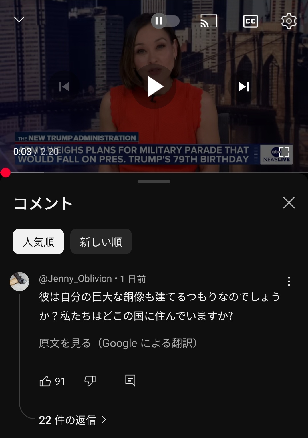 [ワシントン 2日 ロイター] – トランプ大統領の誕生日にあたる6月14日に、米軍が首都ワシントンで大規模な軍事パレードを計画していることが分かった。パレードは陸軍創設250周年を祝う祝賀行事の一環として実施され、6500人を超える兵士、車両約150台、航空機50機が投入されるという。 - 2 : 2025/05/04(日) 12:15:37.88 ID:I0qF31w80