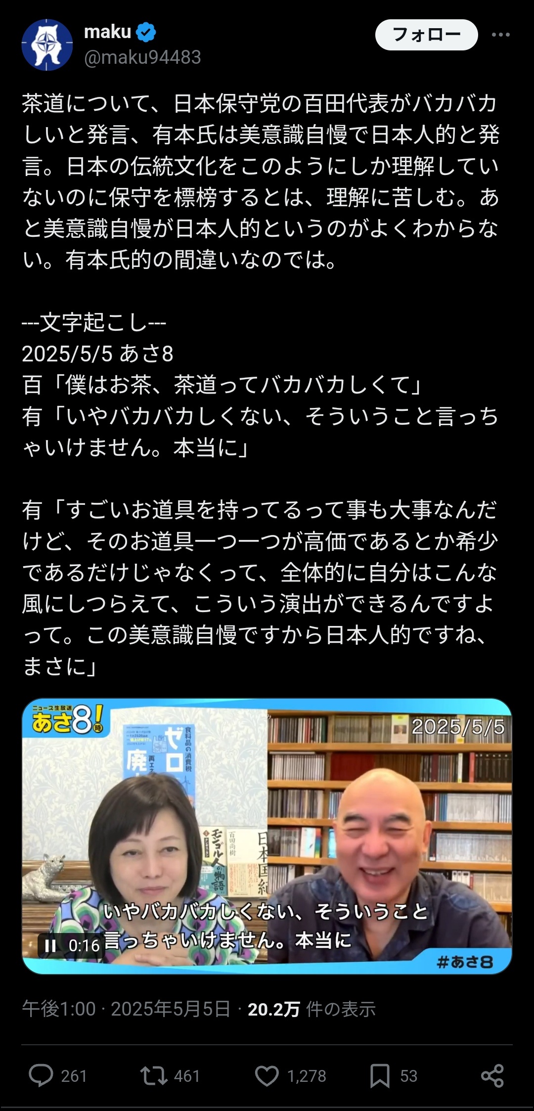 百田尚樹「茶道文化バカバカしいw」有本香「こんな器使って演出出来るみたいな美意識自慢のための日本人らしい文化」
