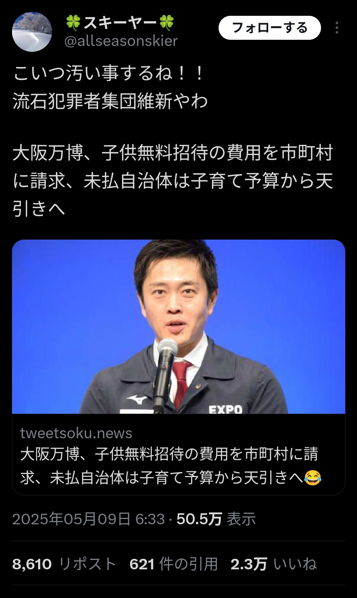 万博「子供の無料招待の費用は各自治体に請求します♥」