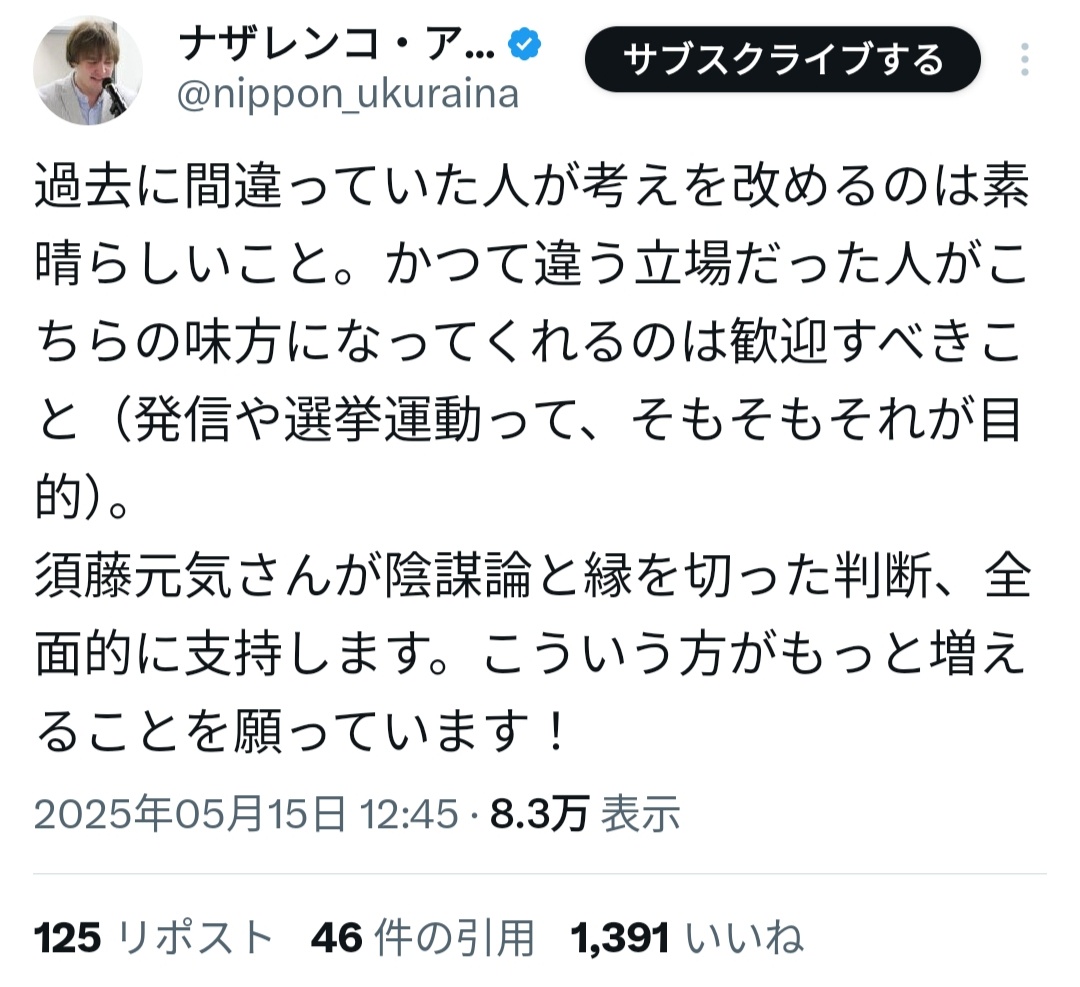 国民民主党特別党員・ナザレンコさん「須藤元気さんが陰謀論と縁を切った判断、全面的に支持します」