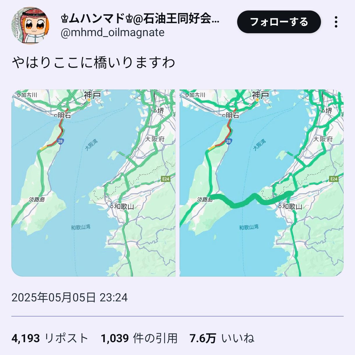 そんな呟きと共に、1枚の加工された地図がX上に投稿され、多くのユーザーの共感を呼んでいる。南四国在住の会社員・@mhmd_oilmagnateさんが2025年5月5日に投稿したのは淡路島と和歌山市周辺の地図。それには、本来存在しないルートが書き足されている。