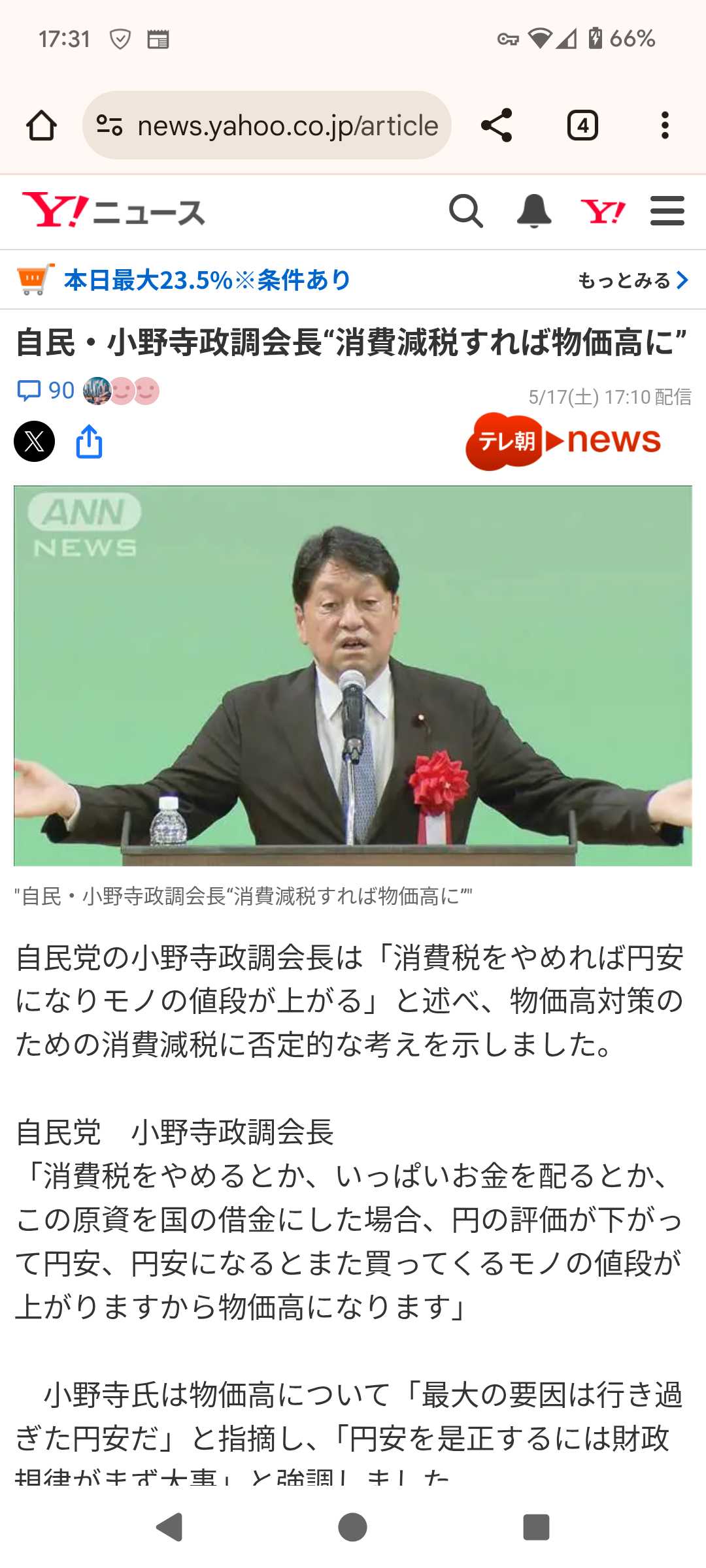 【自民党】小野寺政調会長「消費税を減税したら物価高が進むからダメ」