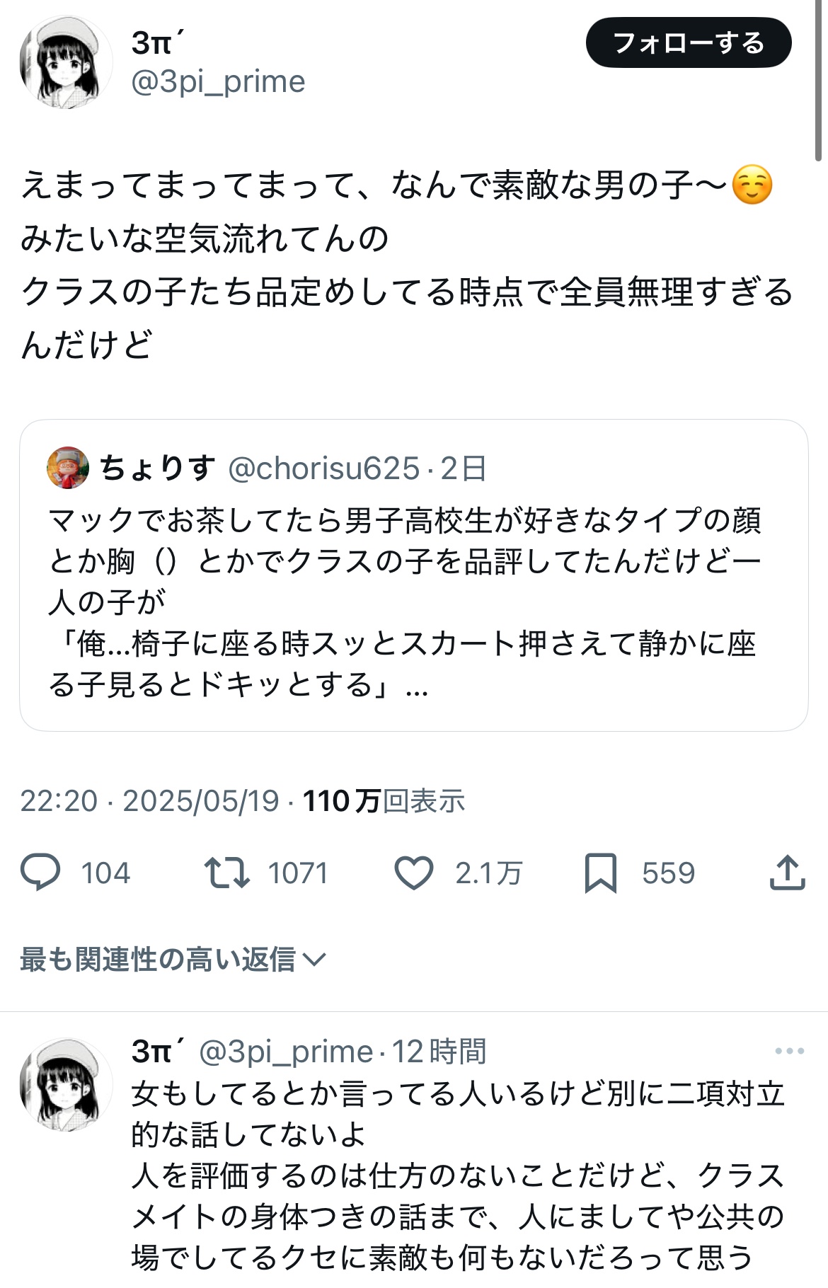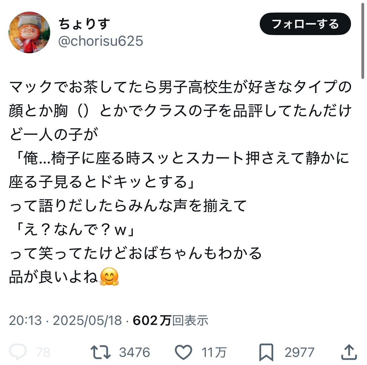 そもそも男子高校生なんかおっさんと同じく価値がない - 29 : 2025/05/21(水) 08:26:00.05 ID:c767gxib0