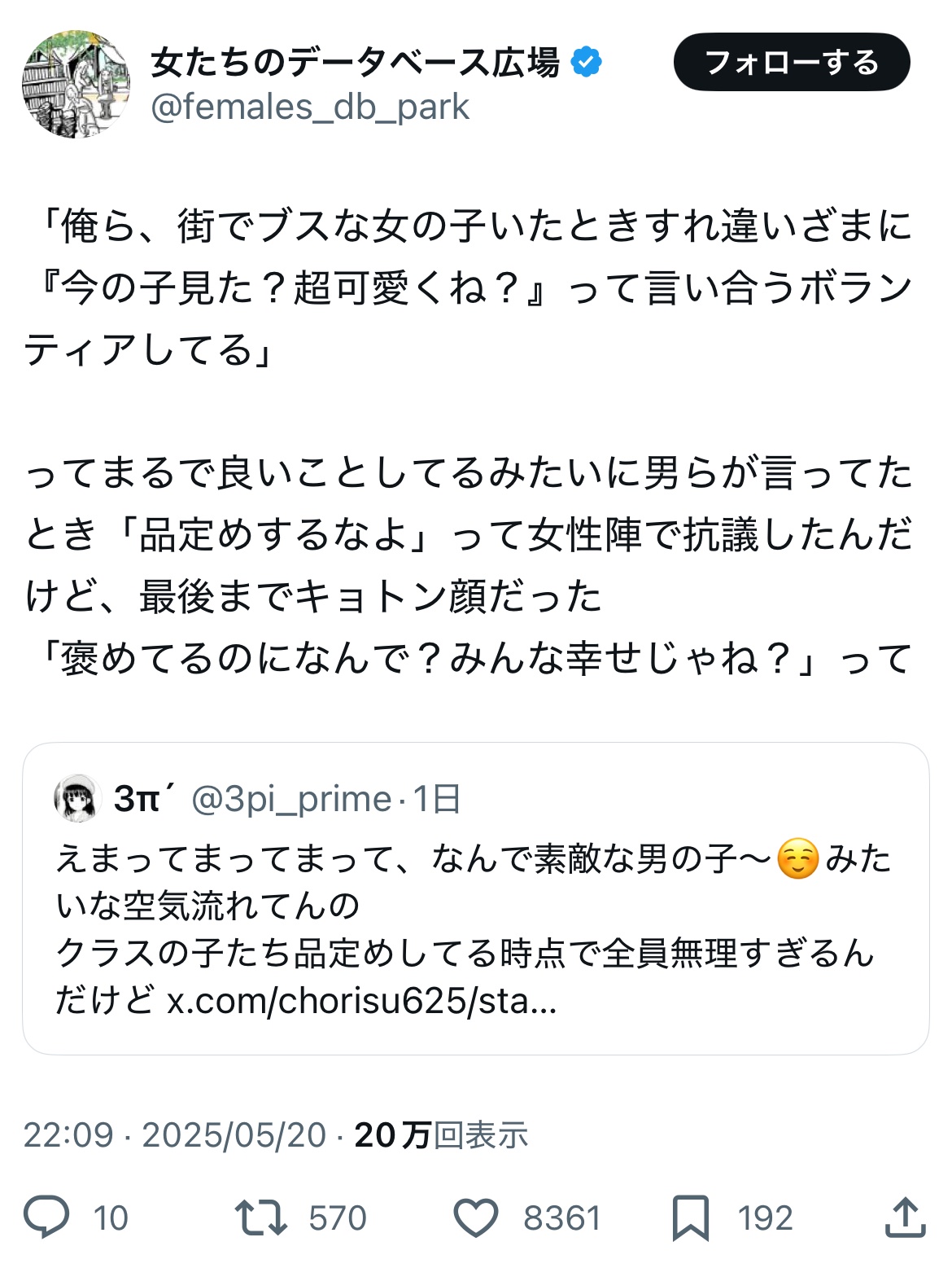 フェミ「ギャー!クソオスが女の子を品定めしやがったことが美談化されてるの!キモイキモイキモイ」