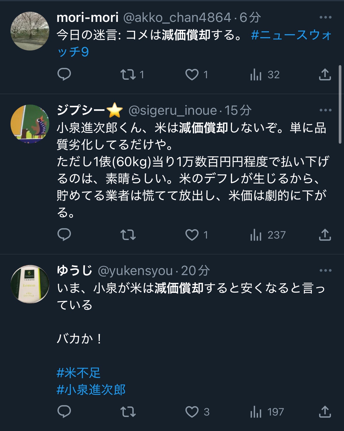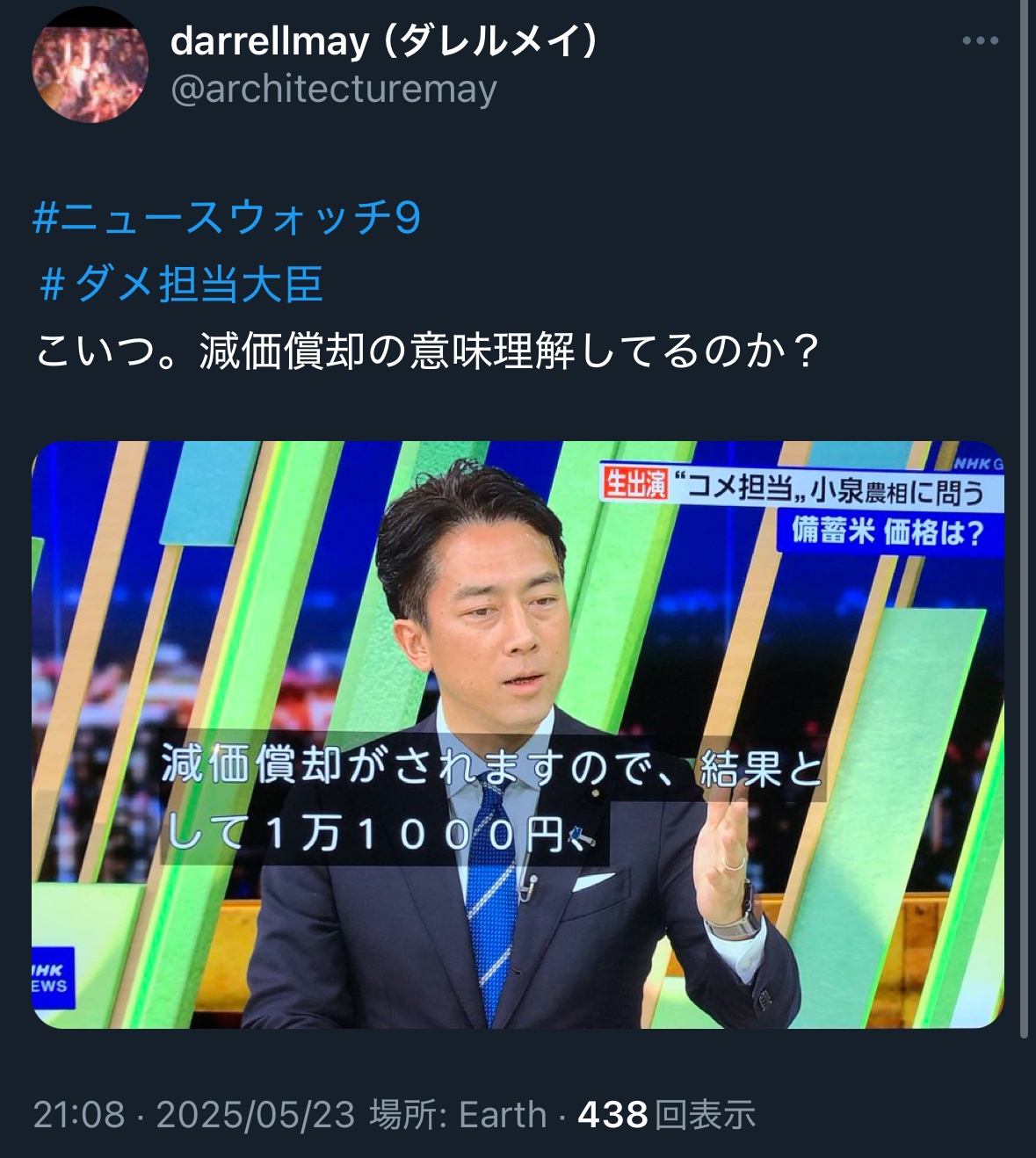 減価償却ってのは例えばコメを1000キロ買った時、毎年それが劣化するから100キロ分ずつ損するってことなんだが進次郎大丈夫なのか