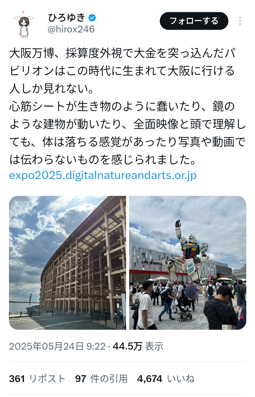 ひろゆき「すまん、万博叩いてたけど行ってみたらクソ楽しかったわ」
