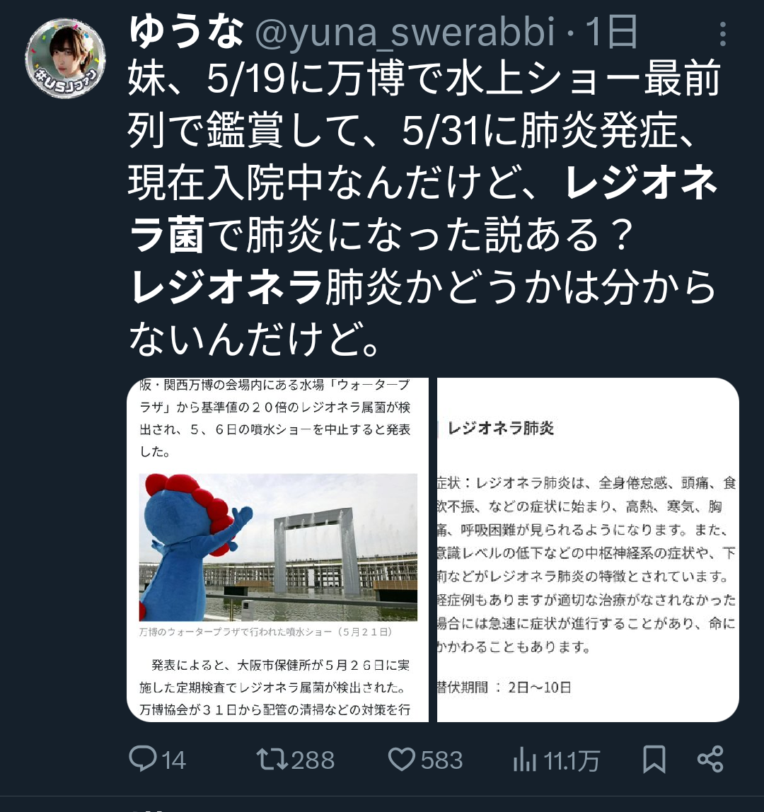 メイド「5月19日に大阪万博の水上ショーを最前列で見た妹が肺炎で入院、自力で呼吸できず完全絶食、寝る体力もありません」