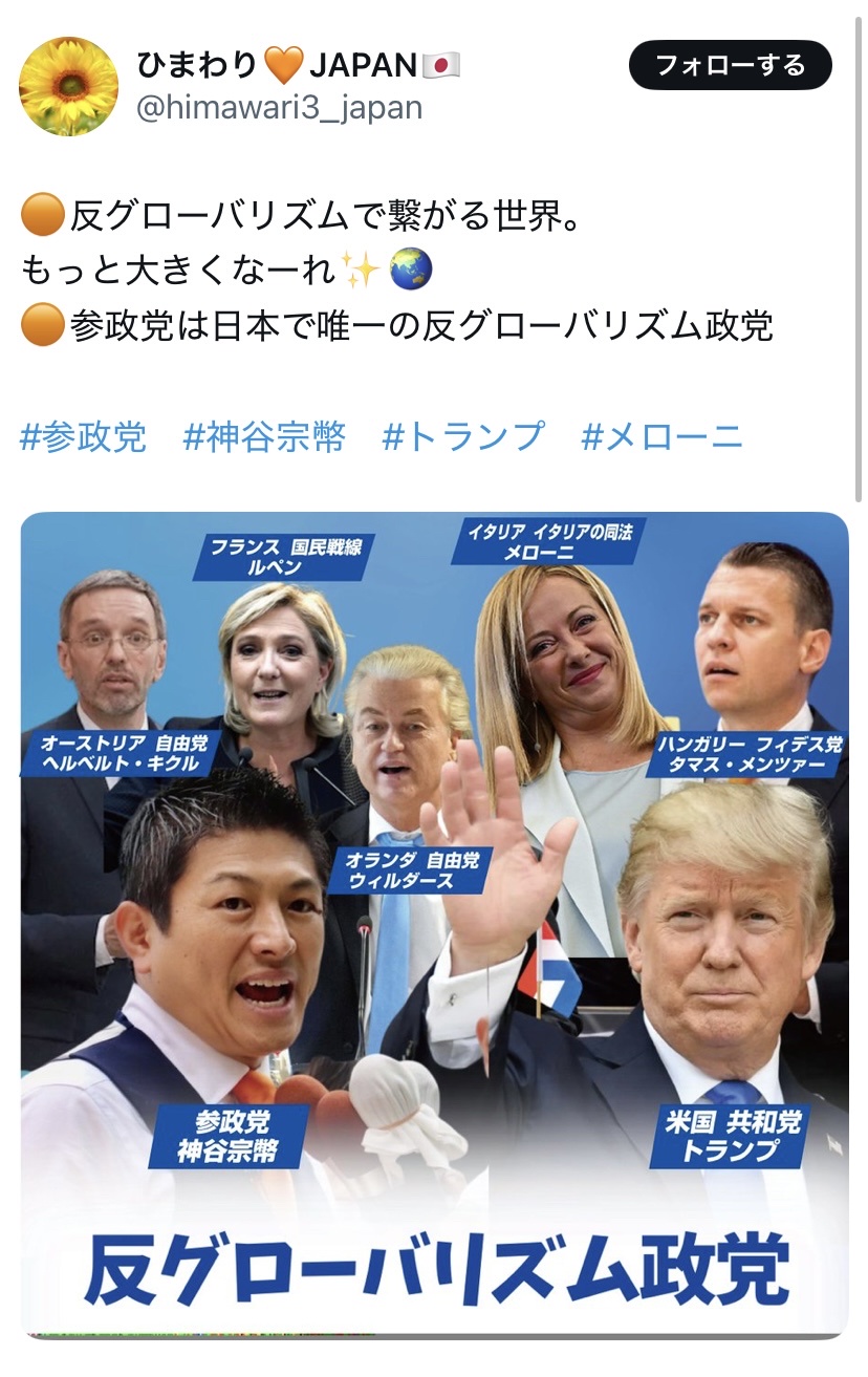 日本人「参政党は日本で唯一の反グローバリズム政党です。」