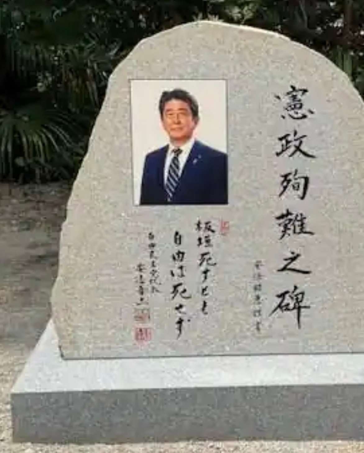 顕彰碑は本殿の近くに建立。正面右側には安倍氏の妻、昭恵さんが揮毫(きごう)した「憲政殉難之碑」の文字が刻まれ、左側には、安倍氏の写真が組み込まれている。今月6日に除幕式が行われたばかりだった。