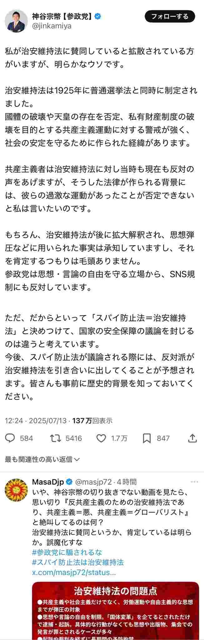 てか普通に「共産主義運動に対抗するため」と書いた直後に「拡大解釈されて思想弾圧に用いられた」って書いてるのがスゴイな