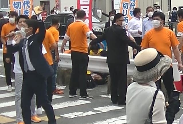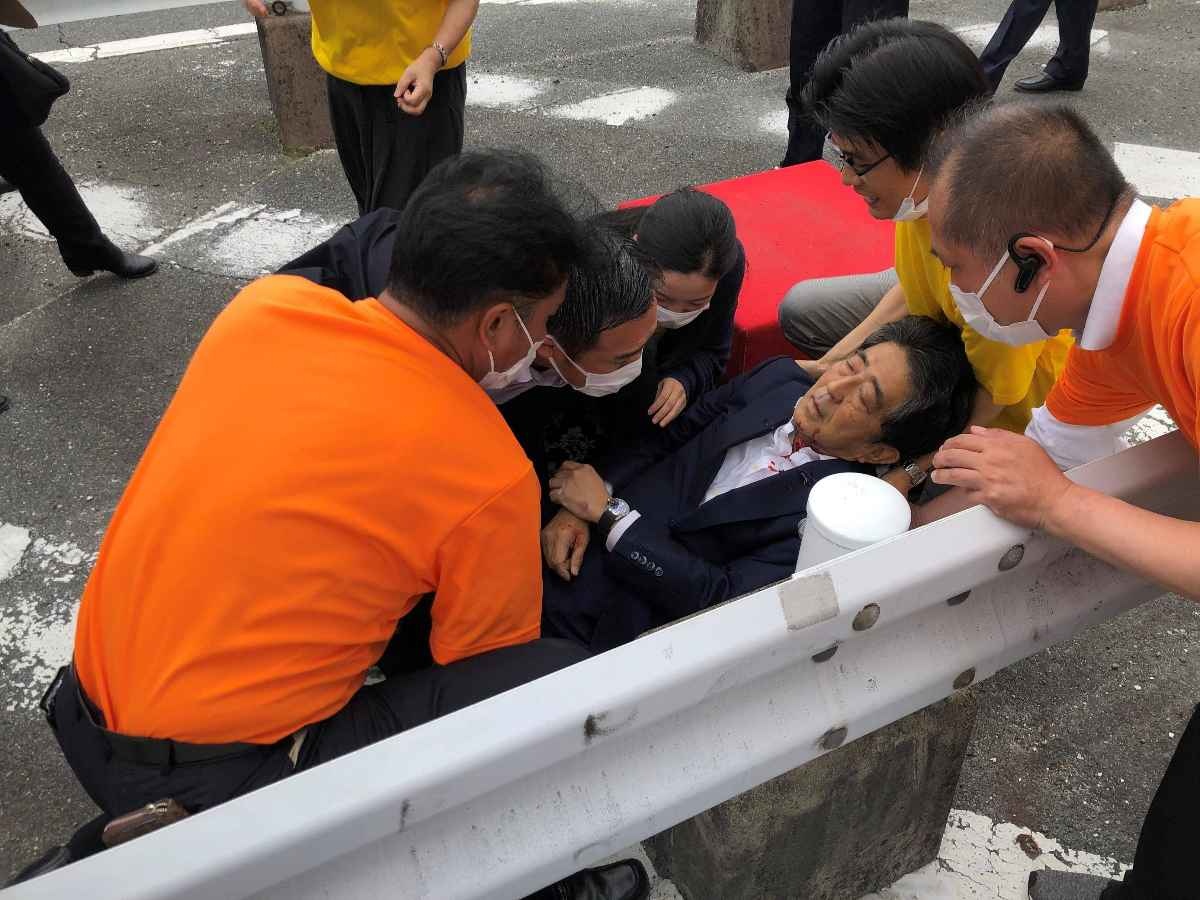 安倍晋三が銃撃された時の写真、なぜか濃いオレンジ色のポロシャツ連中が救護にあたっていた…!いったい何者…?