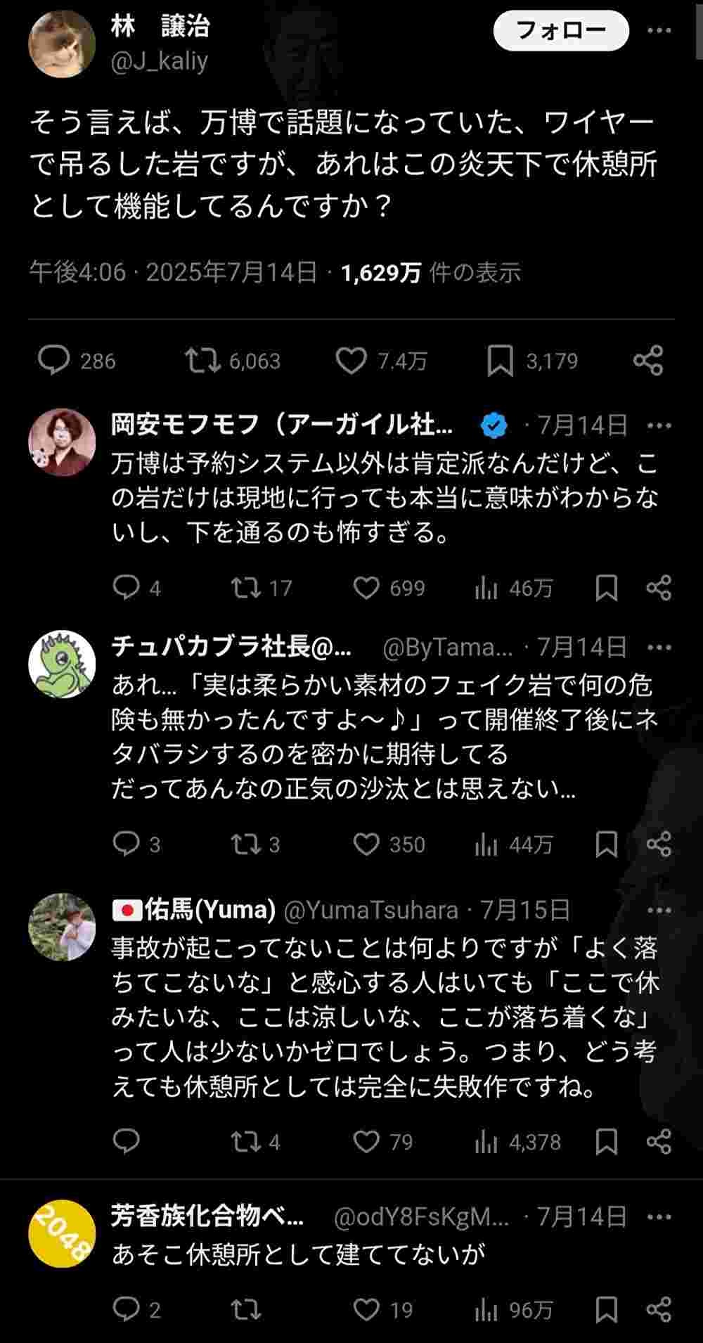 X「万博で話題になっていたワイヤーで吊るした岩って休憩所として機能してるの?」
