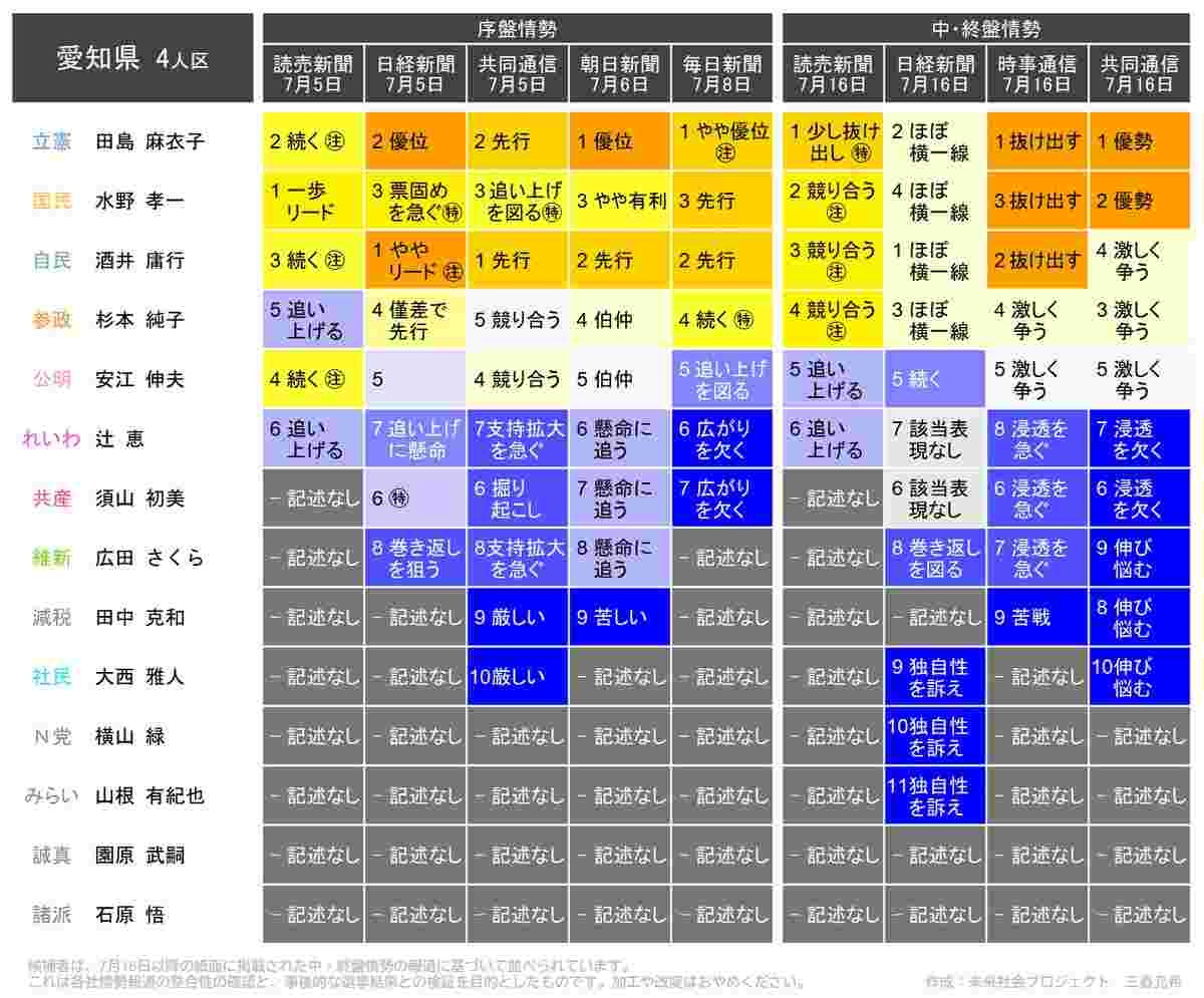 【画像】民主王国の愛知県、4人区なのに自民が落選危機…😱立憲と国民が優勢、残りを自公参で競い合い