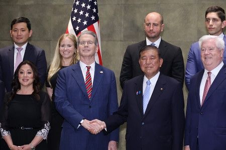 米財務長官と握手する石破首相