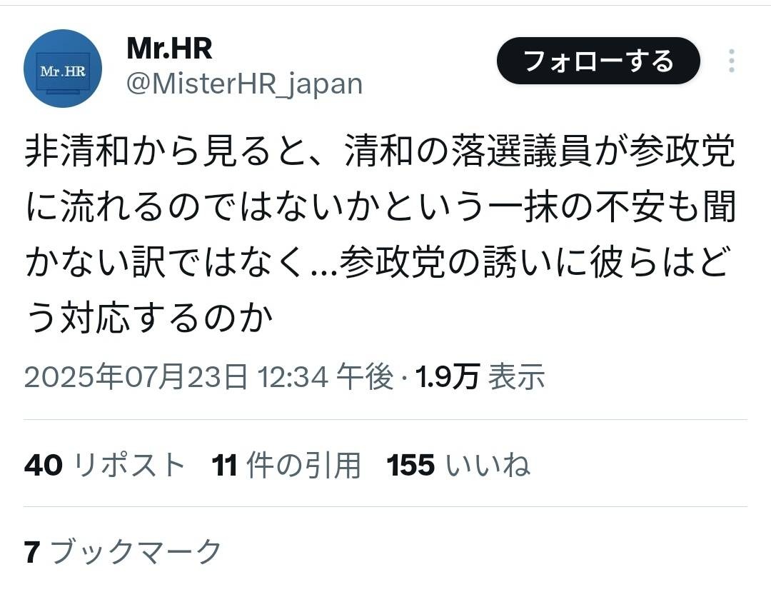 元政治記者「高市以外の場合、清和会の落選議員が参政党に移籍するという噂」