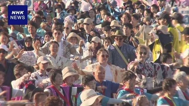 会場のアリーナには浴衣や民族衣装を着た大勢の人が集まり、お笑い芸人の宮川大輔さんなどがやぐらの上から見守る中、公式テーマソング「この地球の続きを」に合わせて踊りました。