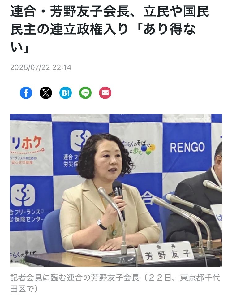 連合BBA、急に正論「こんな時に立憲と国民は仲間割れしてる場合か!共闘し自民参政を潰しなさい。」