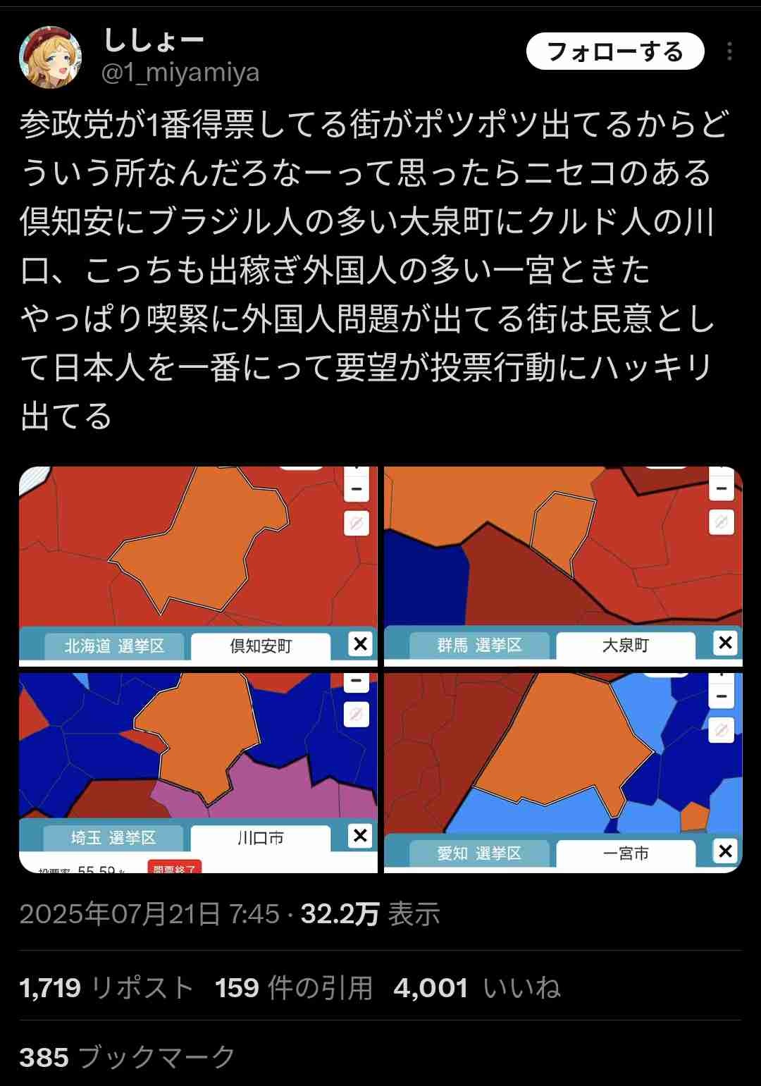 ニセコとか群馬県の外国人労働者の多い市町村で参政党の得票率が高いことを差別的と簡単に批判できるか?