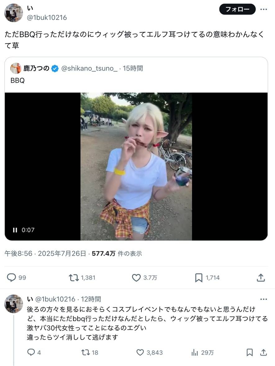 【動画】万博コスプレイヤー鹿乃つの、ダンジョン飯マルシルのコスプレでBBQを楽しむ🍖