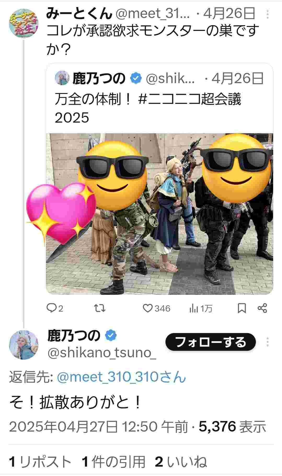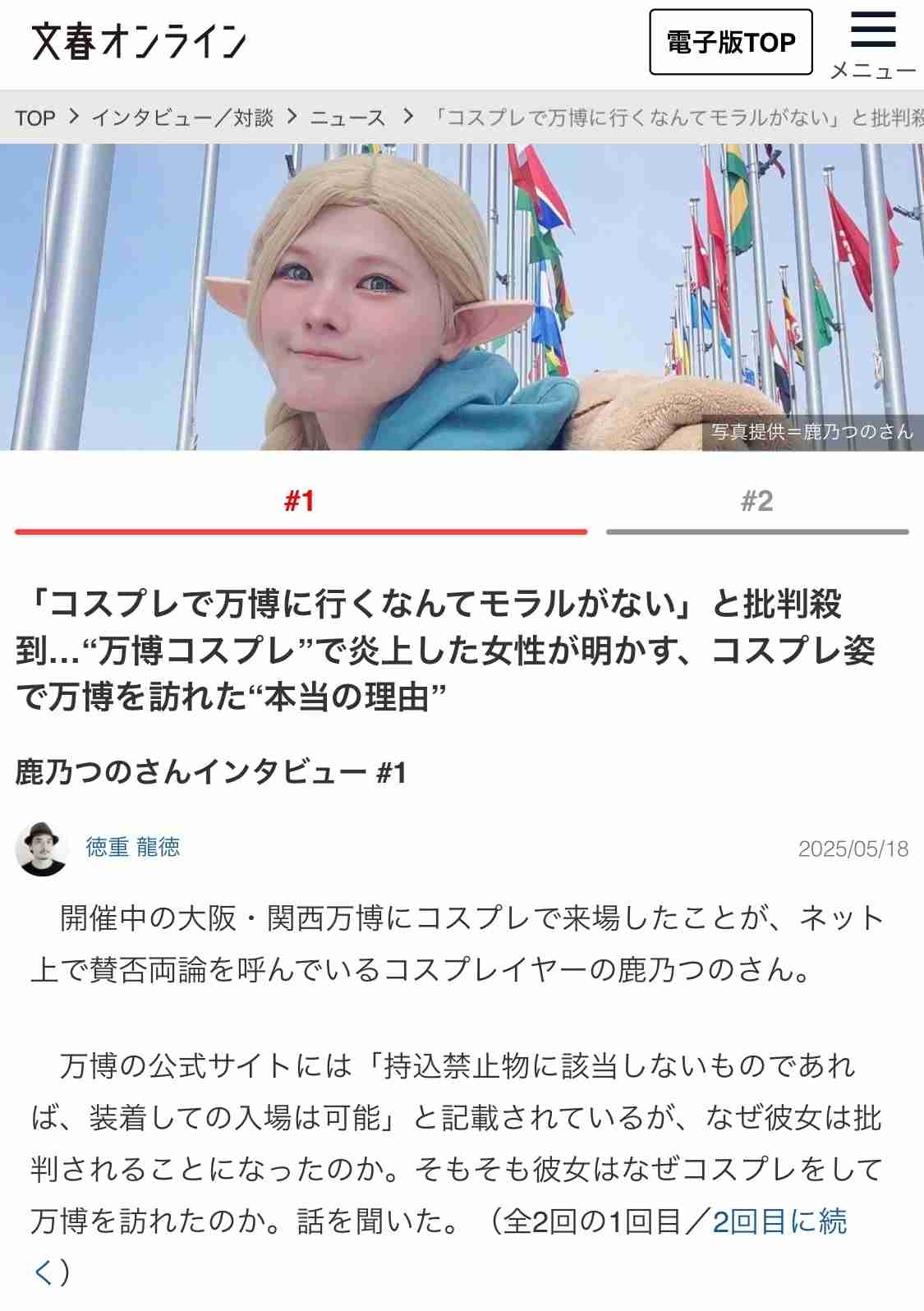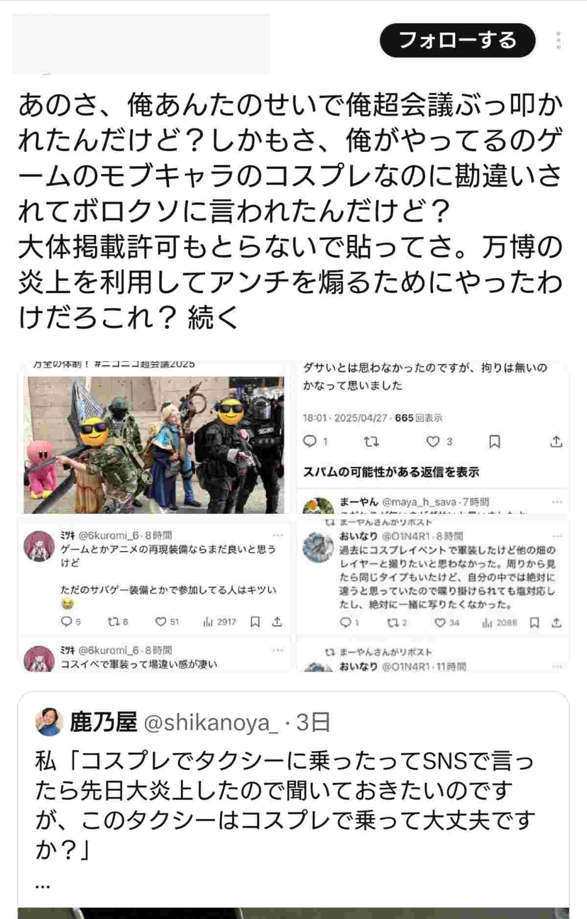 ・他のコスプレイヤーと一緒に撮影し、以前からのマブダチかのように紹介しながら載せるが「掲載許可していないのに勝手に載せられた」「万博の人と知っていたら撮らなかった、炎上に巻き込むな」と怒られる