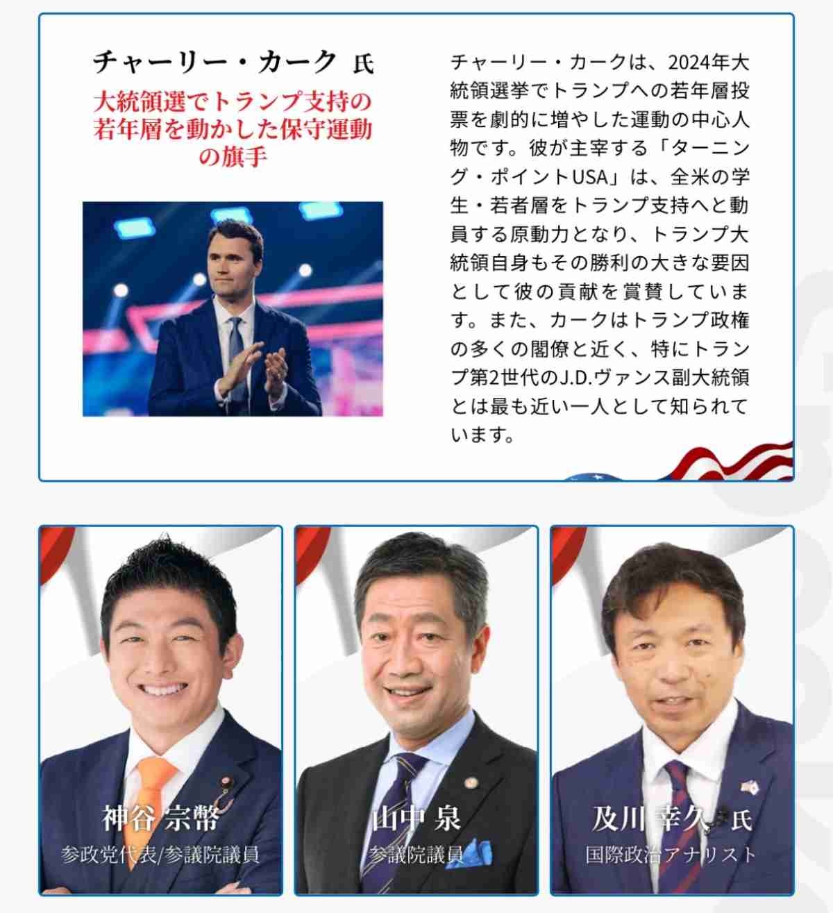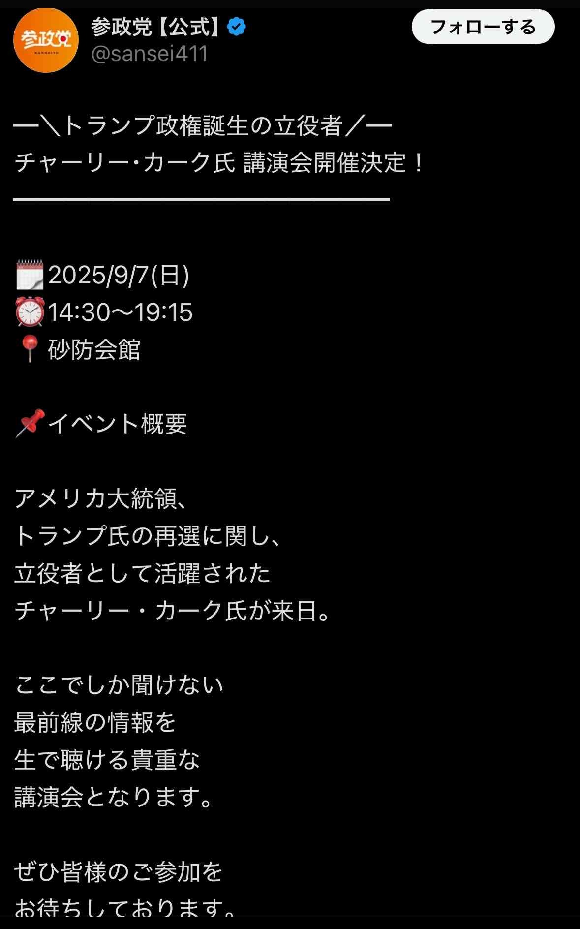 このたび参政党では、2025年9月7日にトランプ政権誕生の立役者であるチャーリー・カーク氏の講演会を開催する運びとなりました。