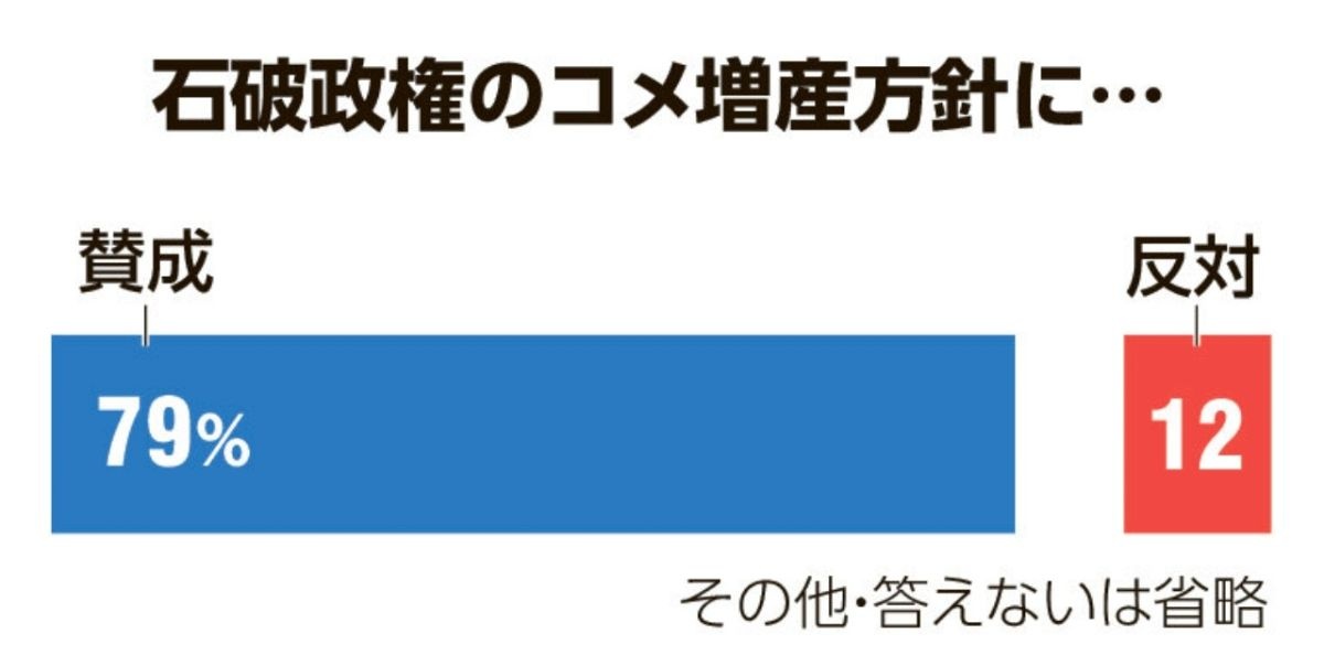 朝日新聞社が8月16、17の両日に実施した全国世論調査(電話)で、石破茂政権がコメの生産量を増やす方針を表明したことについて賛否を尋ねると、賛成が79%と多数で、反対は12%にとどまった。