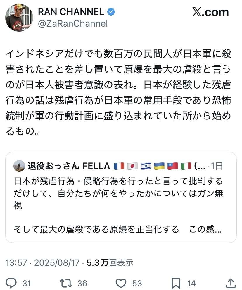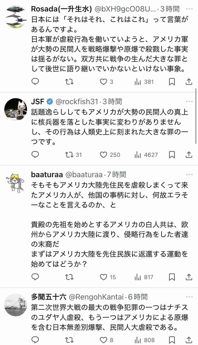 それはそうと原爆投下を持ち出されて発狂するこいつも大概だな