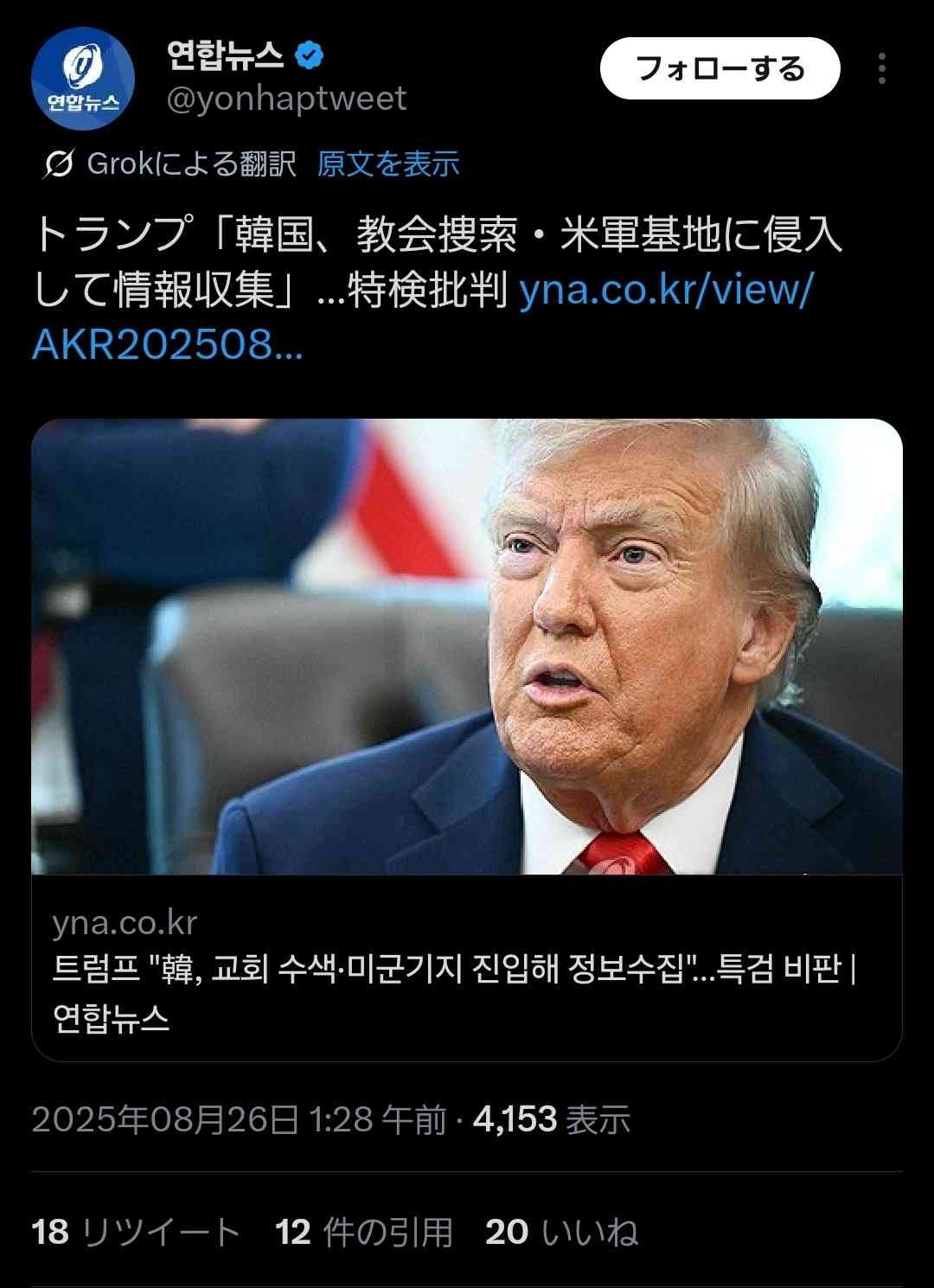 トランプ「韓国政府が統一教会の捜査の一環として米軍基地まで捜査しただと!? ふざけているのか!? 許さんぞ韓国!!!!」