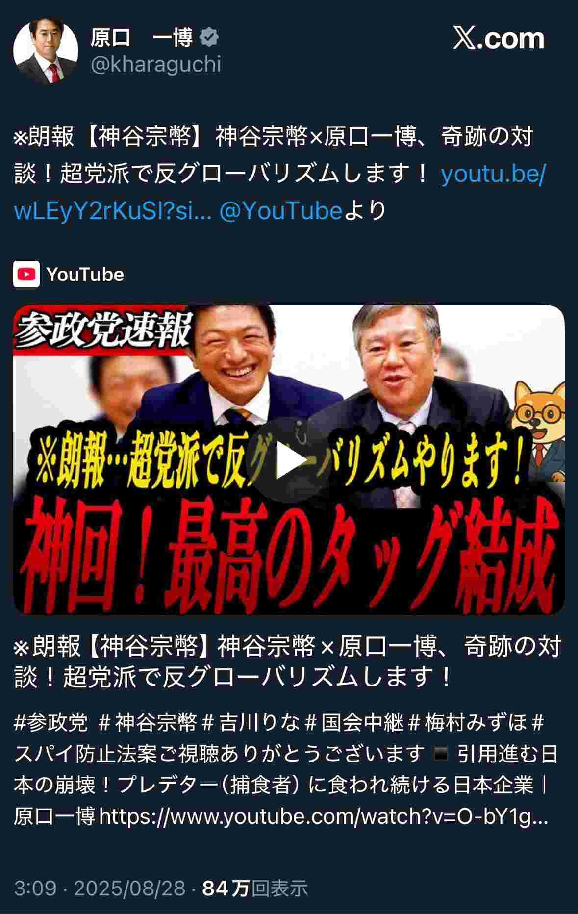 ※朗報【神谷宗幣】神谷宗幣×原口一博、奇跡の対談!超党派で反グローバリズムします! https://youtu.be/wLEyY2rKuSI?si=YdL4MgMHCC4lvBs2