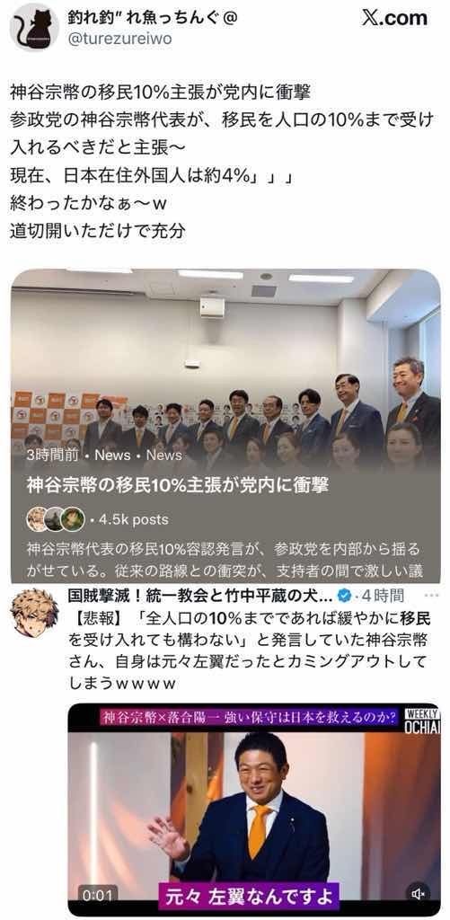 参政党神谷代表「日本は元々移民の国。OECD加盟国平均と同じ全人口の10%まで移民受け入れ可能」→党内さやなどに動揺広がる…