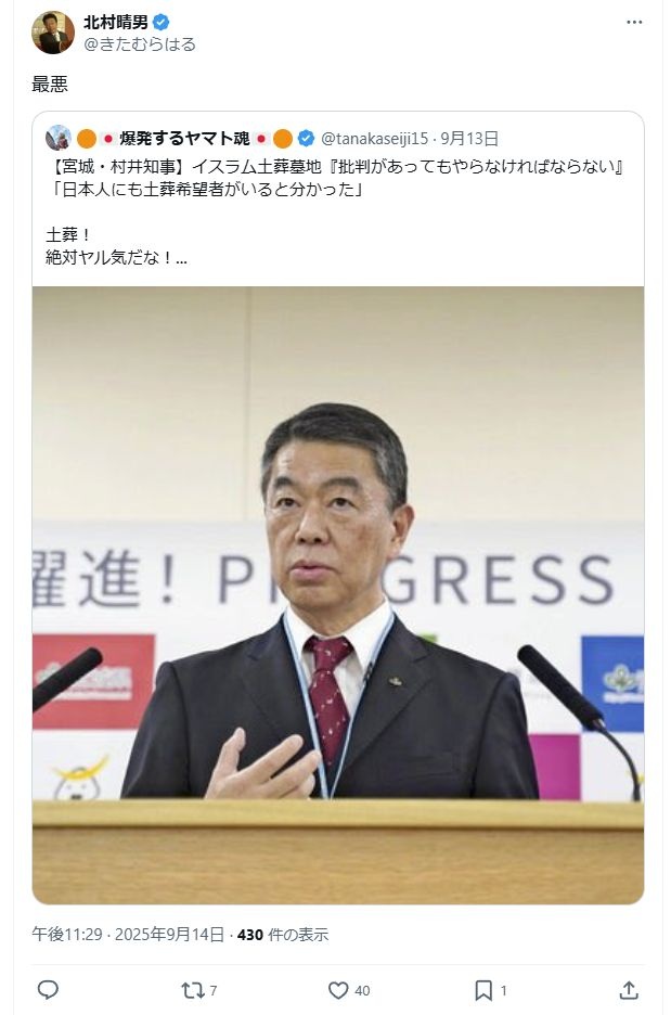北村晴男「最悪」→宮城村井知事、イスラム土葬「批判があってもやらなければならない、日本人にも土葬希望者がいると分かった