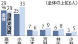 昨年9月の総裁選立候補者のうち石破首相を除いた8人から選んでもらった。3位は茂木敏充・前幹事長、河野太郎・前デジタル相が7%で並び、林芳正官房長官の6%、小林鷹之・元経済安保相の3%が続いた。「いない」と答えた人は14%だった。