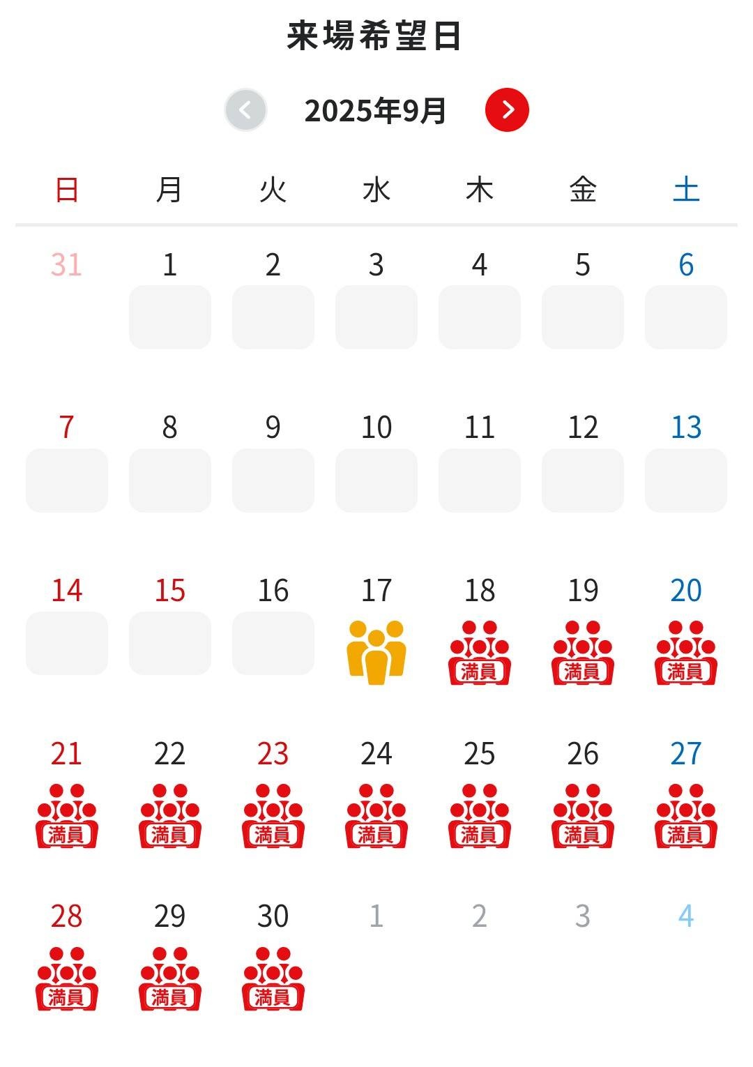 予約画面更新連打してれば1時間に1枠くらい空くかも