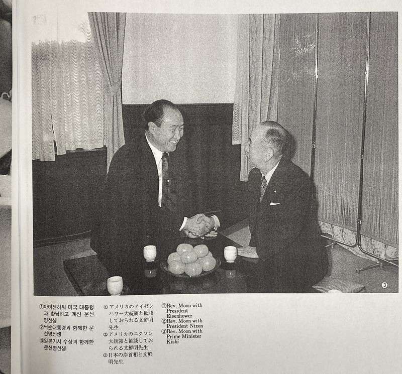 巻頭には、教団を54年に創始した文鮮明(ムン・ソンミョン)氏(2012年に死去)と各国の大物政治家が懇談する様子が掲載されている。