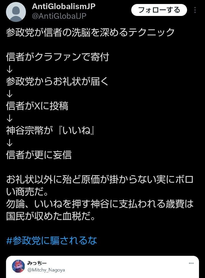金を出した訳だからそりゃ盲信もするだろう。出した分期待なんかしちゃって神谷や参政党のクソどもはお前の事なんかどうでもいいのに。