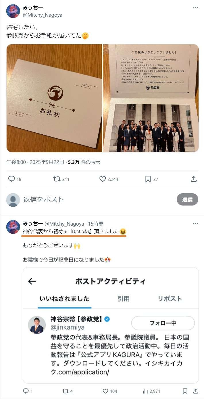 好きな政治家からのお礼状やいいねは地味に嬉しいな