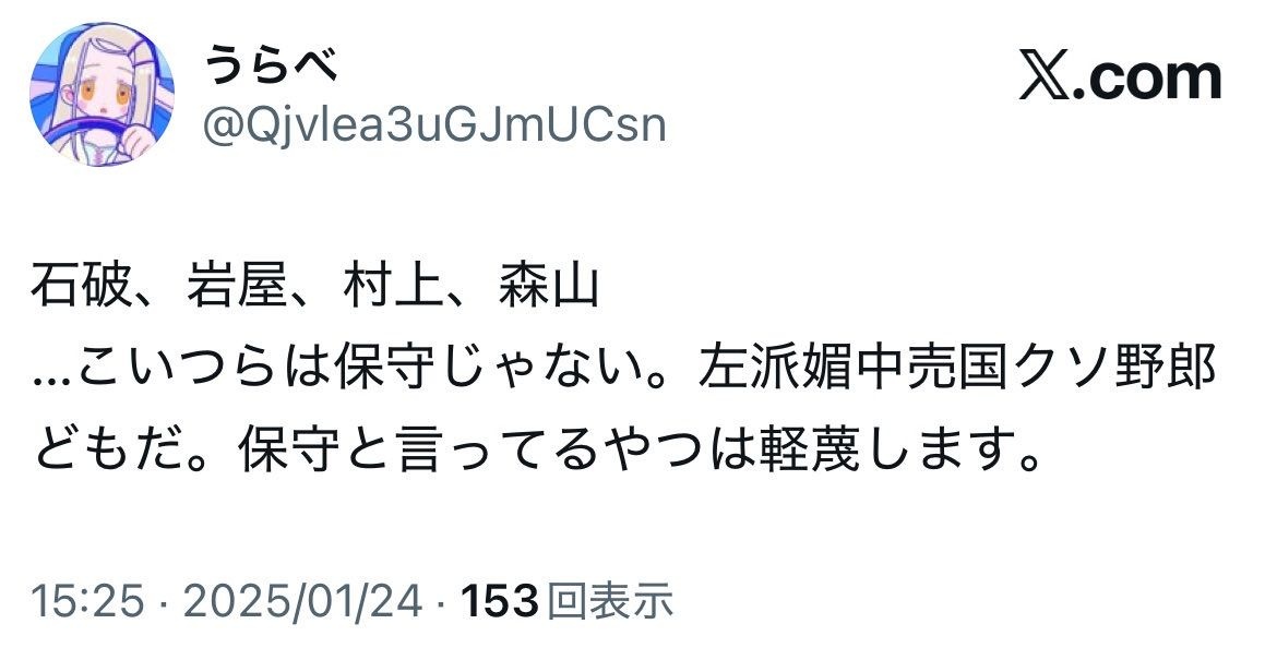 愛国者「石破、岩屋、村上、森山…こいつらは保守じゃない。"左派媚中売国クソ野郎"です」