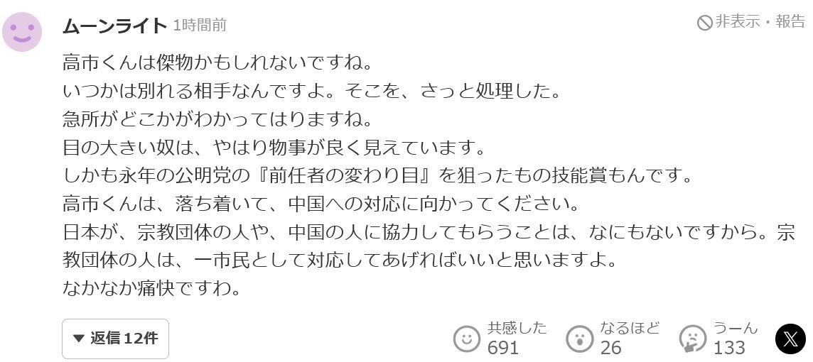 ヤフコメ「高市早苗は傑物! 公明党をさっと処理してやったわwww」