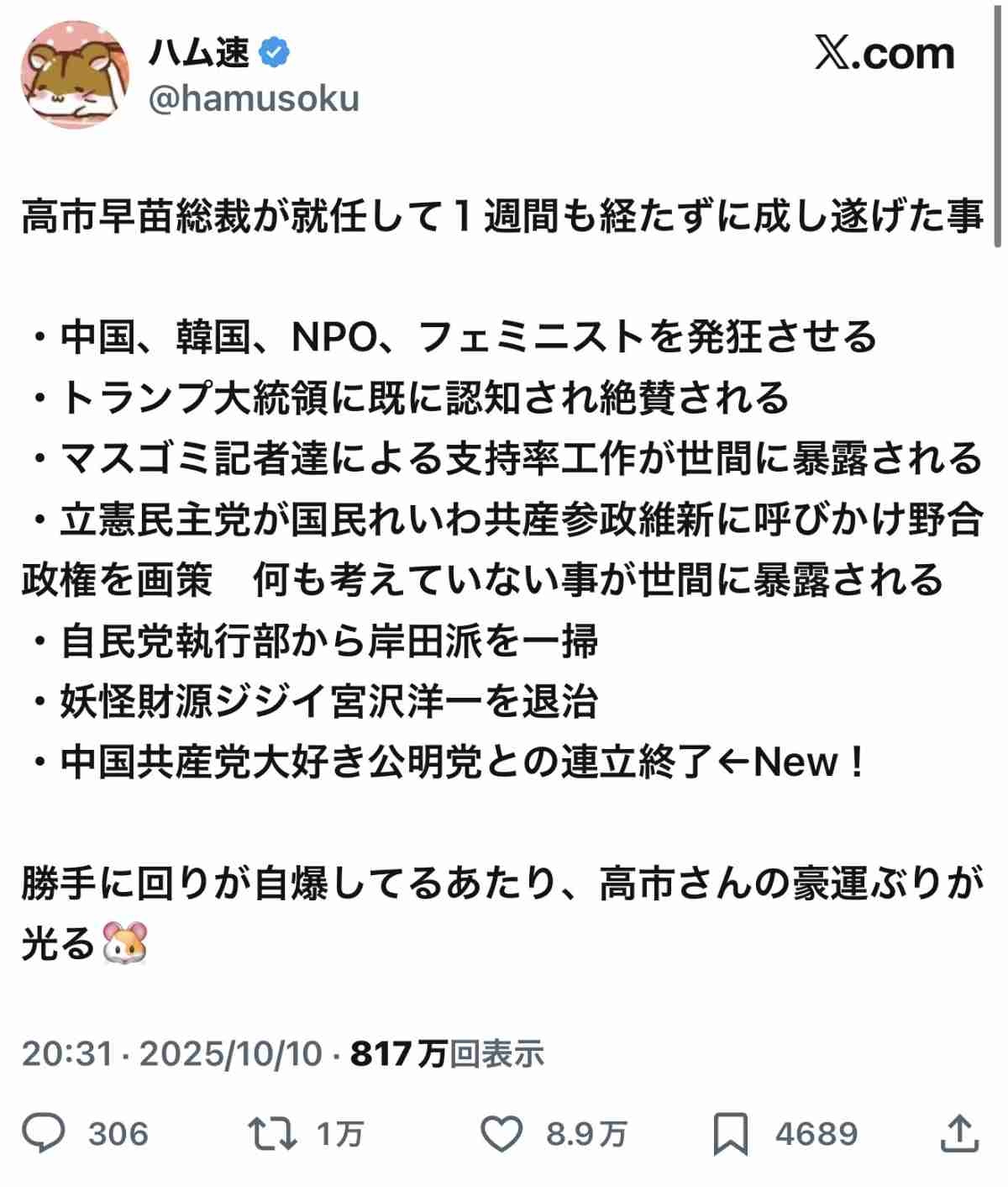 自分が嫌いなものを攻撃してくれる高市を応援してるだけで本人はどうでもいいんだと思う